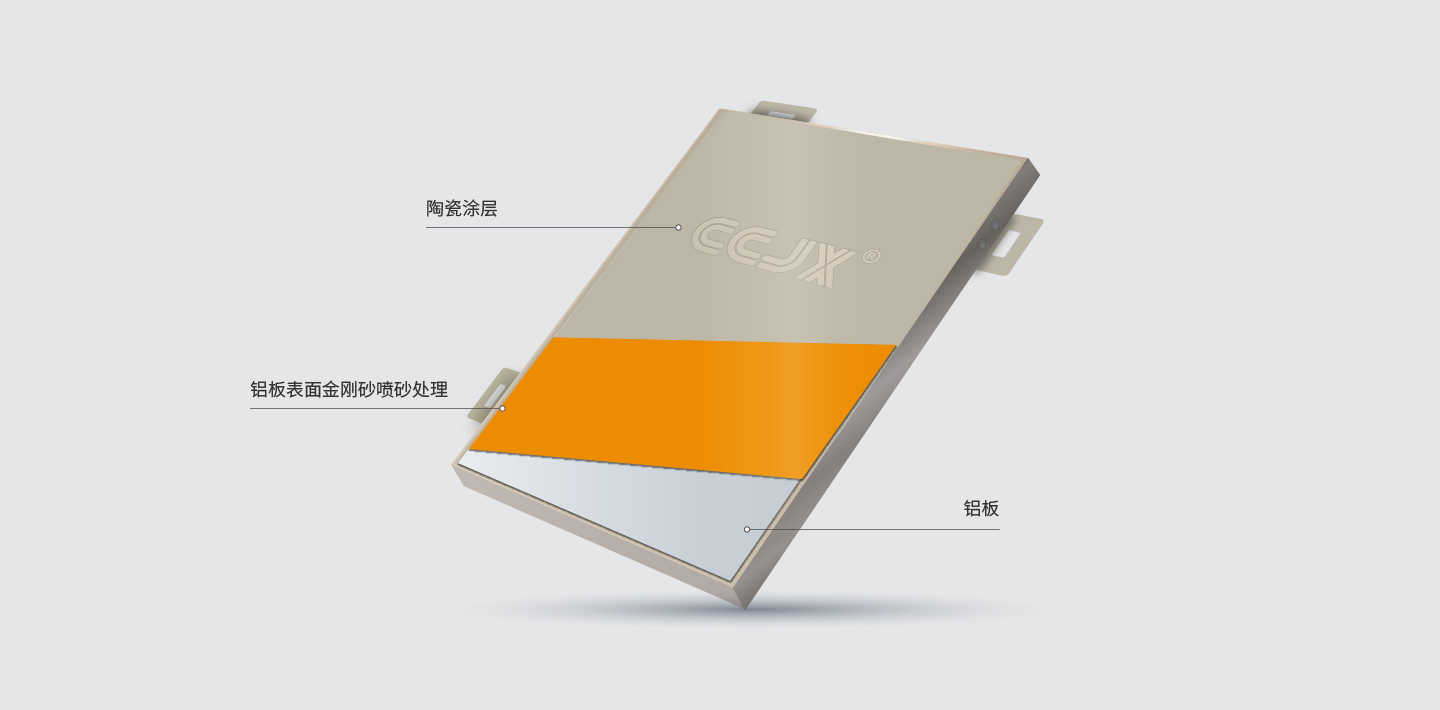 主要由陶瓷涂料、面板、加強筋、掛耳等部件組成,應客戶的要求,在板背面可填隔熱礦巖棉,加強筋、掛耳可直接由面板折彎而成,亦可在面板上另外加裝。為了確保鋁合金板在長期使用中的平整度和強度,我們在板背面裝有加強筋,通過螺栓把加強筋和面板相連接,使其成一個牢固的整體,從而增加其強度和剛性。